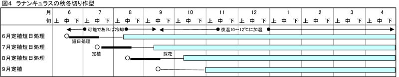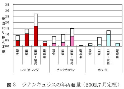 - ラナンキュラスは6〜8月に定植すると45〜60日で開花する。短日処理を施すと採花は約20日遅れるが、年内収量の増加が顕著であり、良花率も高くなる(図3)。これにより端境期であった秋期にラナンキュラスを出荷することが可能になる。また、夏期にコンテナを冷却すると収量、品質が向上する(図4)。高温期には生育停滞を起こしやすいため、高地温時の定植を避け、その後の管理にも注意する。