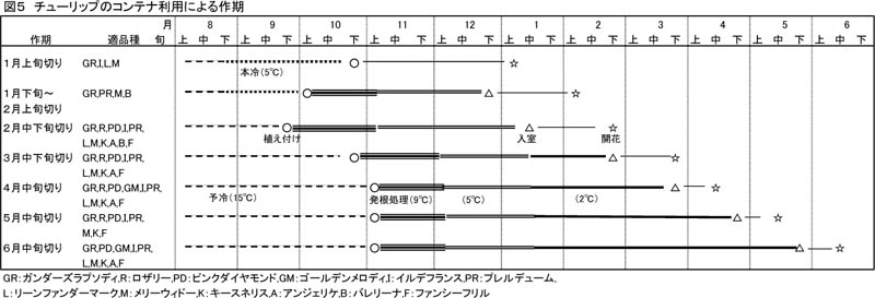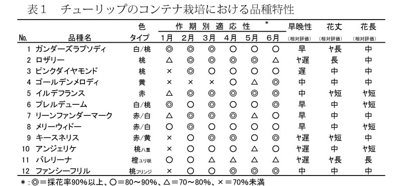 - チューリップのコンテナ利用による1月上旬〜2月上旬切りの作期では採花率が品種間でばらつくが、2月中旬切り以降の作期ではいずれの品種も高い採花率を示す(表1、図5)。6月切りの作期では、品種によって芽の伸びすぎや茎折れが発生するため、品種選定に注意が必要である。