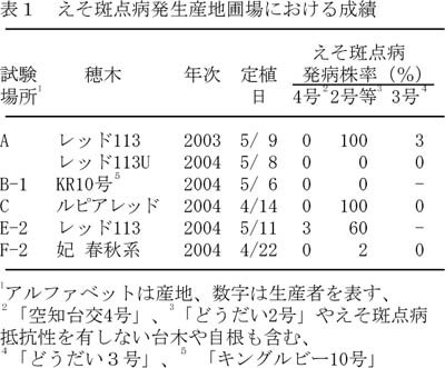 - えそ斑点病に対して「どうだい3号」と同様に質的抵抗性を有する。レース1,2yに対して「どうだい2号」と同程度のやや強い抵抗性を示し、激発圃場を除き、一般の発生圃場では十分な実用性を有する(表1、2)。レース0、レース2に対して質的抵抗性を有する。