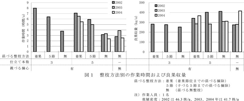 - 子づる3本仕立てに比べ、子づる5本仕立ておよび親づる無摘心で作業時間が短く省力的である。また、孫づる整枝の簡略化による作業時間の短縮効果が高く、着果節位までの孫づるを整枝する従来の方法に比べて子づる5本仕立て・孫づる無整枝および親づる無摘心・孫づる無整枝により、整枝・誘引に関わる作業時間がほぼ半減される(図1)。