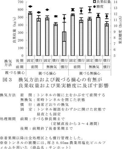 - 子づる伸長期から着果期までトンネルをわずかに開けた状態(約4mおきにトンネル裾部を約20p上げる程度)で固定することにより、昼夜の気温較差が増大し、生育がやや促進され、果実重、糖度ともにやや向上する(図3)。
