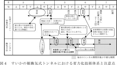 - 裾換気式トンネルにおける着果や果実品質の安定性と孔開け換気式トンネルの省力性と生育初期の高温管理効果が期待できる技術体系と注意点は図4のとおりである。