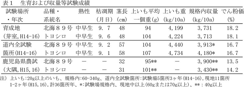 - 「北海89号」は、早生の「とうや」を母、高でん粉価の「83068C-51」を父とするジャガイモシストセンチュウ抵抗性系統間の交配集団から育成されたポテトチップ加工用の系統である。