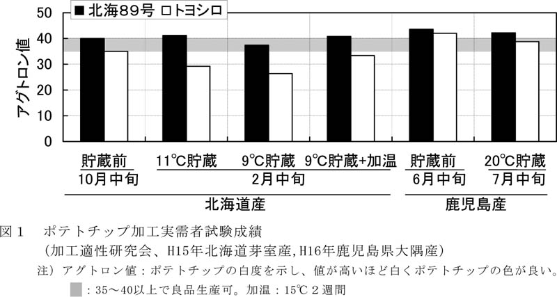 - ポテトチップのカラーは、北海道産の貯蔵前後、鹿児島県産においても「トヨシロ」より良い(図1)。