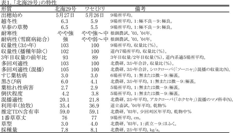 オーチャードグラス「北海29号」は、早生で越冬性に優れる。1番草と4番草が多収で、早春から晩秋まで利用できる。3年目収量は高い。北海道および東北北部に適応し、採草・放牧に利用できる。