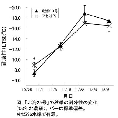 - 越冬性と早春の草勢は「ワセミドリ」より優れる。耐寒性は“やや強”、耐病性(雪腐病総合判定)は“強”でいずれも「ワセミドリ」より優れる(表1)。秋季は急速に耐凍性が高まる(図)。