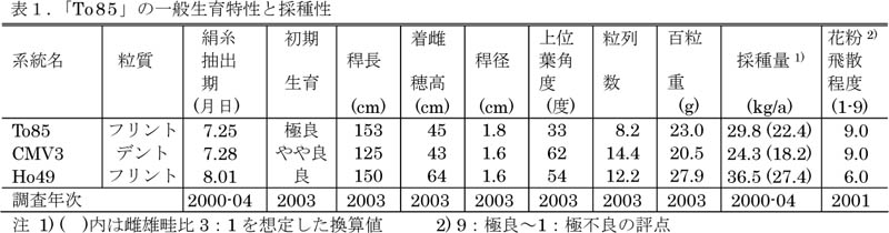 サイレージ用トウモロコシの親自殖系統「To85」(ティーオーハチジュウゴ)は、極早生のフリント種で、初期生育とすす紋病抵抗性に優れ、組合せ能力が高く、一代雑種品種の親系統として利用できる。