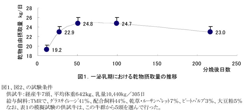 - 泌乳期間中の乾物摂取量は、分娩1週間後頃では19.2kgと低い値であったが、その後急激に増加して50日目前後までに最高値に達した後、乾乳期に向けて徐々に減少する(図1)。