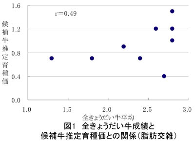 - 全きょうだい牛の肥育成績と候補牛の推定育種価の相関係数が、中程度以上の値(脂肪交雑:0.49)であったことから、全きょうだい牛の肥育成績を用いることにより、従来の直接検定のみの一時選抜に比べ、より正確に候補牛の能力を推定できる(図1)。