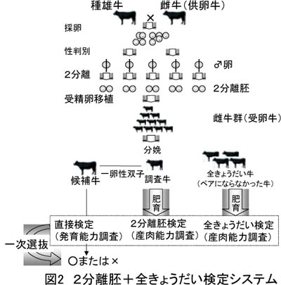 2分離胚由来双子と全きょうだい牛を用いた検定は、作出する候補牛が登録可能で、期待される遺伝的改良量も高いことから、黒毛和種種雄牛の産肉能力を推定する一次選抜のシステムとして最も適している。