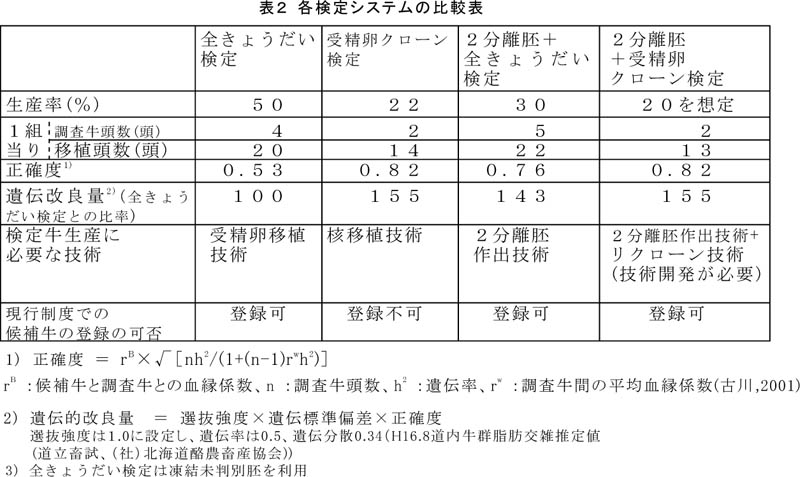 - 受精卵クローン検定は、遺伝改良量が最も高く移植頭数も少ないが、現状では候補牛を登録できない。また、2分離胚+受精卵クローン検定はリクローン技術が必要であり、現状では技術的に困難である。これに対し、「2分離胚+全きょうだい検定」(図2)は、作出する候補牛が登録可能で、技術的にほぼ確立されており、全きょうだい検定に比べ期待される遺伝的改良量が高い(表2)。