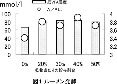 - イモ皮主体サイレージの給与によりルーメン内容液の総VFA濃度およびA/P比が高くなる傾向にあるが(図1)、pHの値はイモ皮主体サイレージを給与飼料の乾物比50%まで増加させてもに大きな変化がない。