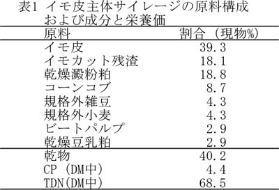 - イモ皮主体サイレージの乾物、粗蛋白質およびTDN含量はそれぞれ40.2%、4.4%および68.5%である(表1)。