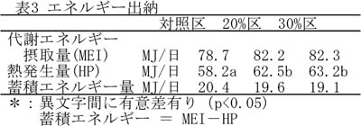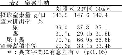 - イモ皮主体サイレージの給与は、糞尿中への窒素排出率を低下させ、窒素蓄積率を有意に高める(表2)。また、エネルギー出納では、熱発生量は高くなるが、蓄積エネルギー量には差がなく、イモ皮主体サイレージは濃厚飼料の一部代替として利用できる(表3)。