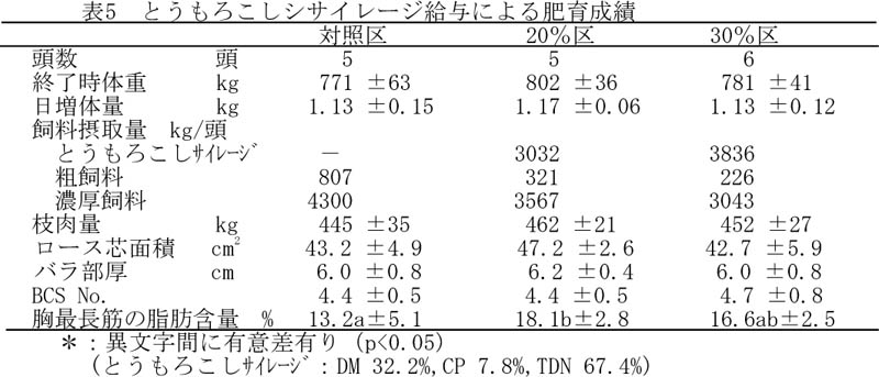 - とうもろこしサイレージは、濃厚飼料TDNの20%代替給与であれば、濃厚飼料を多給する肥育(対照区)と同程度の増体および枝肉成績が得られる。しかし、代替割合を30%に増加 させると、肉色(BCS)値が高くなり、肉色が濃いと判定される個体が多い(表5)。従って、 とうもろこしサイレージは濃厚飼料TDNの20%給与とするのが適当で、この方法で肥育すると1頭当たりの飼料費が約13,000円節減できる。