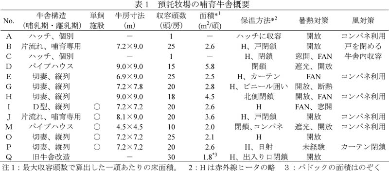 - 集団哺育施設における寒冷対策としては赤外線ヒーター、ビニール・コンパネ等の開閉式覆いや囲いの設置、カーテン閉鎖、断熱、日射利用がみられることから、集団哺育施設では冬季間の日射を有効に利用できる施設構造とし、日中は舎内温度を上げて換気を促進するとともに、夜間は赤外線ヒータとビニール等の開閉式覆いを設置して保温に留意する。また、暑熱対策ではカーテン・吊り戸の開放、送風機、遮光施設の利用がみられることから、夏季間は壁面をできるだけ開放するとともに、日射による暑熱を防ぐ遮光構造とする(表1)。
