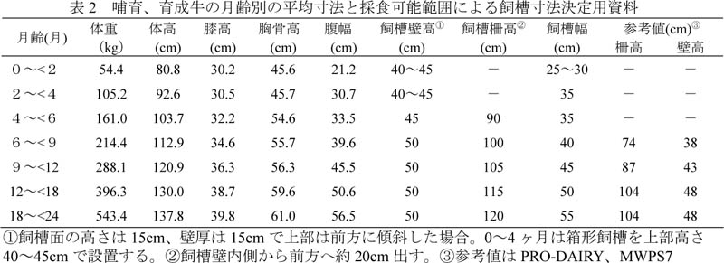 これまでの哺乳期の飼養施設はカーフハッチによる個別飼養が基本とされてきたが、預託牧場において自動哺乳装置の導入による集団哺育が試みられている。そこで、この集団哺育施設の計画時の留意点を明らかにするとともに、乳牛の体格を規準とした哺乳・育成牛用の飼槽形状及び寸法を明らかにする。