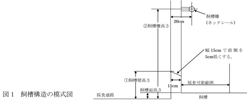 - 哺育牛舎の飼槽は、2〜4ヶ月齢までは現地実態調査により箱形飼槽を40〜45cmの高さに設置して利用する。また、4ヶ月齢以上の育成牛の飼槽壁の高さは育成牛の膝高よりも高く胸骨高以下として各月齢の飼槽寸法を設定し、模擬飼槽での採食可能範囲の計測と採食姿勢の調査により検討したところ、採食通路からの飼槽面の高さが15cm、飼槽壁厚が15cmで上方を傾斜させた飼槽形状の場合には、4〜6ヶ月齢未満では飼槽壁高さ45cm、6ヶ月齢以上であれば飼槽壁高さ50cmとし、飼槽柵は飼槽壁内側から約20cm前方に出し、最大高さの目安を体高の平均値の85%程度として設置する(表2、図1)。