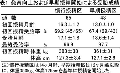 乳牛の初産分娩を早めるには8ヶ月齢までの発育が重要で、良好に発育した育成牛は8ヶ月齢で春機発動(体重約260kg)、11ヶ月齢までに性成熟に至り12ヶ月齢には授精可能となる。また、受胎後の飼養管理が適切であれば、21〜24ヶ月齢で分娩しても初産次成績に大きな問題はない。