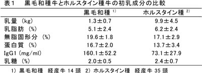 - 黒毛和種牛の初乳はホルスタイン牛と比較して乳量は少ないがIgG1濃度が高く、子牛への免疫賦与の効果が高い(表1)。