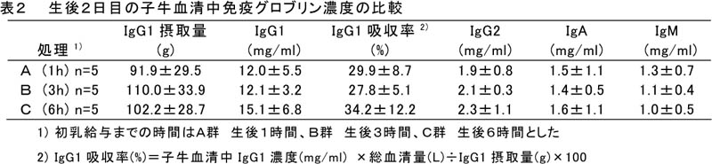 - 黒毛和種子牛は生時体重の約10%の初乳を自力哺乳できる。出生後6時間以内にホルスタイン種牛凍結初乳1.5リットルを子牛に給与すると、子牛血中へ移行する免疫グロブリン量やIgG1の吸収率に差はない(表2)。