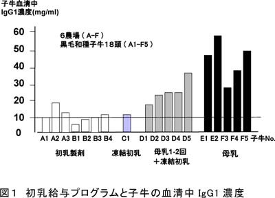 黒毛和種牛の初乳はIgG1濃度が高く、子牛への免疫賦与効果が高い。黒毛和種子牛への初乳給与は少なくとも生後6時間は母牛から自然哺乳させ、乳量が少ないと思われるときはホルスタイン種凍結初乳や初乳製剤を追加給与する。