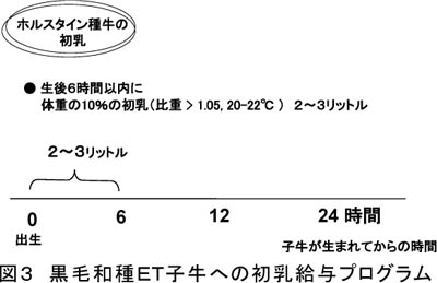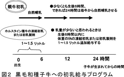 以上の成績より、黒毛和種牛の初乳成分と子牛への初乳給与量と給与までの時間などが明らかになり、黒毛和種子牛への初乳給与プログラムを提示した(図2、図3)。