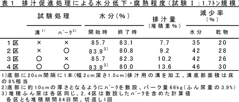 1)高水分ふん尿(堆積量約1.7トン)を堆肥舎にそのまま堆積した場合(1区)と比べ、排汁の流出路を設けるために、床面に10cm程度バークを敷設(2区)あるいは床面に溝を切り(3区)、それらの上にふん尿を堆積した場合では、排汁量は多くて水分減少率も高くなる。バーク敷設と溝切りを併用した場合(4区)では効果はより大きい(表1)。