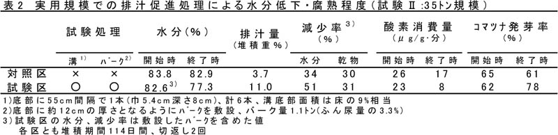 2)実用規模(堆積量約35トン)においても、堆肥舎床面の溝切りとバーク敷設を併用(試験区)することで、溝無し・バーク無しの場合(対照区)よりも、約4カ月間の堆積で排汁量は約3倍に増加し、水分減少率は顕著に高くて、水分除去が進む(表2)。