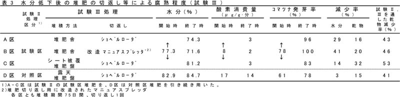 高水分乳牛ふん尿の堆肥としての利用性を高めるため、簡易な手段による排汁促進、それによる水分低下をはかって、腐熟化と取り扱い性向上を進める。ここでは堆肥舎床面に溝切り、バーク敷設することの効果を明らかにする。併せて水分低下後の堆肥についてより一層の腐熟を目指し、堆積方法、切返し方法の影響を明らかにする。