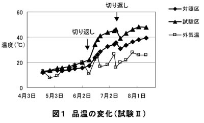 3)試験区では対照区と比べて品温は高く(図1)、酸素消費量の低下やコマツナ発芽率の向上など腐熟が進む。また終了時の水分含量は77%と大きく低下して、取扱い性が改善される(表2)。