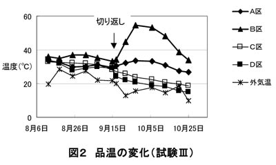 4)溝切りとバーク敷設の併用によって水分が低下した堆肥(試験区)は、その後の堆肥舎でのショベルローダ(A区)や改造マニュアスプレッダ(B区)の切返し、ないしシート被覆堆肥盤でのショベルローダ切返し(C区)により、約2カ月間の堆積で、一層の腐熟を進めることができる(表3)。また、改造マニュアスプレッダを切返しに用いることで、発熱が促進される(図2)。