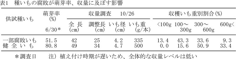 - 種いもの催芽処理期間中の腐敗は、使用可能な種いもが減少するだけでなく、腐敗種いもを植え付けると不萌芽の増加や減収となる(表1)。