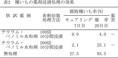 - チウラム・ベノミル水和剤100倍液への10分間浸漬処理は、薬害がなく、本病に対して高い防除効果が認められるが(表2)本処理のみで本病を完全に防ぐことは困難である。
