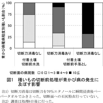 - 以上のことから、青かび病による腐敗を軽減させるためには、付着土壌の水洗などによる除去や、切断刀を清潔に保つことにより、切断面になるべく感染源となる土壌が付着しないようにして、速やかに清潔な石灰を粉衣することが基本であり、薬剤浸漬の併用によって防除効果はより高まる(図3)。