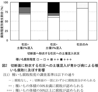 - 種いも切断前に、表皮に付着している土壌を水洗後風乾したり、切断刀を種いも切断のたびに70%エタノールに瞬間浸漬してペーパータオルで拭くと本病の発生は軽減する(図1)。一方、種いもの付着土壌が石灰に混入した条件で切断面の粉衣処理を行うと、青かび病の腐敗いも率は高くなり、腐敗程度も激しくなる(図2)。これらのことから、ナガイモ表面の付着土壌は本病の感染源として重要である。
