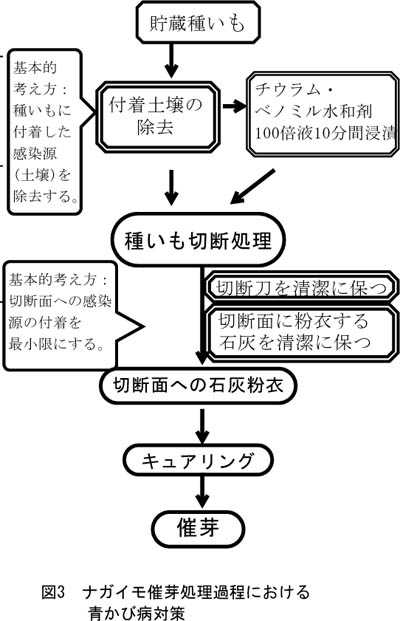催芽過程における種いも腐敗の主因は青かび病菌であり、種いもに付着している土壌の切断面への付着が主要な感染源である。種いもの付着土壌の除去、切断刀や粉衣用石灰の清潔な保持が本病の防除対策の基本で、種いもの薬剤浸漬の併用で効果は高まる。