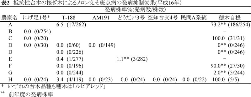 - 台木の「どうだい3号」、「にげあし1号」、「T-188」、「AM191」は本病の発病を全く認めないため実用的な抵抗性台木である(表1、2)。また、「空知台交4号」も発病を認めず、実用性が十分期待できる。台木利用で発病がなかったハウスで翌年自根栽培を行なうと発病する。発病の多い実とり品種は「パブリレッド」、「いちひめ」、「ビューレッド」および「妃(春秋系)」である。