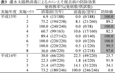 - 灌水太陽熱消毒は本病に対して高い防除効果が認められる(表3)が、夏季の高温が認められない年では防除効果が不安定である。しかし、灌水太陽熱消毒の持続効果は1作しか期待できない。