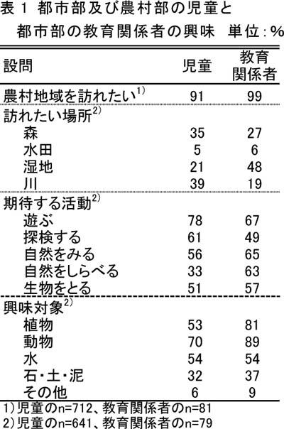 - 多くの児童は農村地域への興味関心が高く、農村地域の様々なタイプの環境で生物を対象とした自由な活動を期待している(表1)。また、都市部の教員と環境教育団体職員は、農村地域へ興味関心を持ち、児童より湿地への興味関心が高く、生物を対象とした観察や研究活動を期待している。このことより、環境教育の場として、自由に活動できかつ生物が生息できる湿地ビオトープのニーズは潜在的に高いものと考えられる。