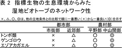 - 指標生物の生息環境から見て、農村部は都市部より、生息空間どうしのつながり(ビオトープのネットワーク)を確保しやすい(表2)。また、モデル試験地には指標生物のすべてが確認され、都市部の湿地ビオトープよりも、生物の多様性や生物生息の持続性を確保しやすいことが認められる。