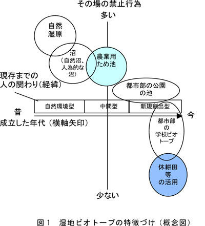 - 湿地ビオトープを自然環境型、中間型、新規創出型に分類した(図1)。いずれの場合も現状の湿地ビオトープの多くは、自由な出入りが限定されていた。新規創出型において、禁止行為が生じる背景の一つとして、生物生息の持続性が低下する懸念が挙げられる。
