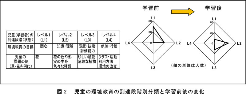- モデル試験地は「生物個体の発見や捕獲の容易さ」、「生物多様性の確認の容易さ」、「川や周辺の林地や農地との生態系的および活動的連続性」を有しており、そこでの環境学習後の児童は、環境教育の到達段階であるレベル1または2から、レベル2または3へ移行した(図2)。この結果と関係者による評価から、モデル試験地は環境教育の拠点や生物とのふれあいの場としての役割を持っている。