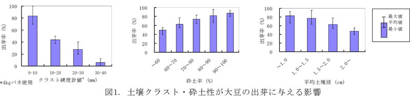 - 大豆の出芽率を低下させ苗立ち本数の確保を阻害する土壌物理条件は、クラスト硬度10mm以上(4kgバネ使用)、砕土率80%未満、平均土塊径では1.5cm以上である(図1)。