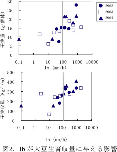 - 現地ほ場の土壌断面形態および土壌物理性のデータによる解析の結果、Ibは孔隙や亀裂などの土壌構造の発達程度による影響を強く受けることから、苗立ち以降の大豆生育を低下させる要因は、土壌構造が未発達で亀裂や孔隙の少ない土壌環境である。