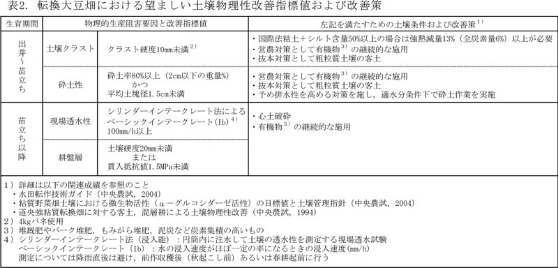 - 以上をふまえ、シリンダーインテークレート法を転換大豆畑における土壌物理性の評価手法とし、望ましい土壌物理性改善指標値および改善策を示す(表2)。