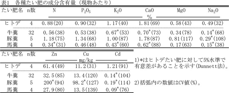 - ヒトデたい肥の成分は窒素含有量が牛糞たい肥とほぼ同等で、マグネシウムを除く塩基が牛糞たい肥より有意に高く、カドミウム含有量が対照の3種類のたい肥よりも高い(表1)。ヒトデたい肥の窒素無機化量は対照たい肥と同程度である。