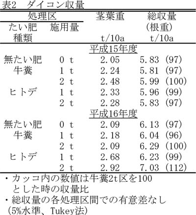 - ダイコンのヒトデ1t/10a施用区、2t/10a施用区では、牛糞2t/10a施用区とほぼ同等の収量が得られる(表2)。