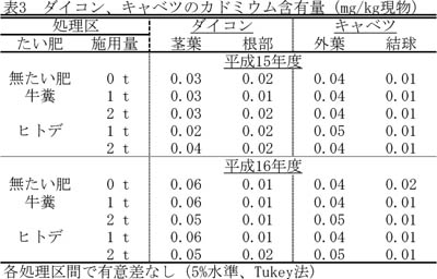 - 2年間の連用では可食部のカドミウム含有量の処理間差は認められず、CODEX基準値案(ダイコンで0.1mg/kg、キャベツで0.05mg/kg)を下回る(表3)。たい肥2年連用後の栽培跡地土壌のカドミウム含有量(0.1MHCl抽出)には処理間差が認められないが、ヒトデたい肥のカドミウム含有量が高いことから、露地野菜畑におけるヒトデたい肥の施用量は年間1t/10aを上限とする。