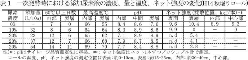 2)ロールベール表層部のネットは、ロールの重ね合わせと堆積時に濃度10%程度の尿素液(約10L/ロール)を表面散布することで接触部の温度を高めるとともに長期間維持する(表2)。